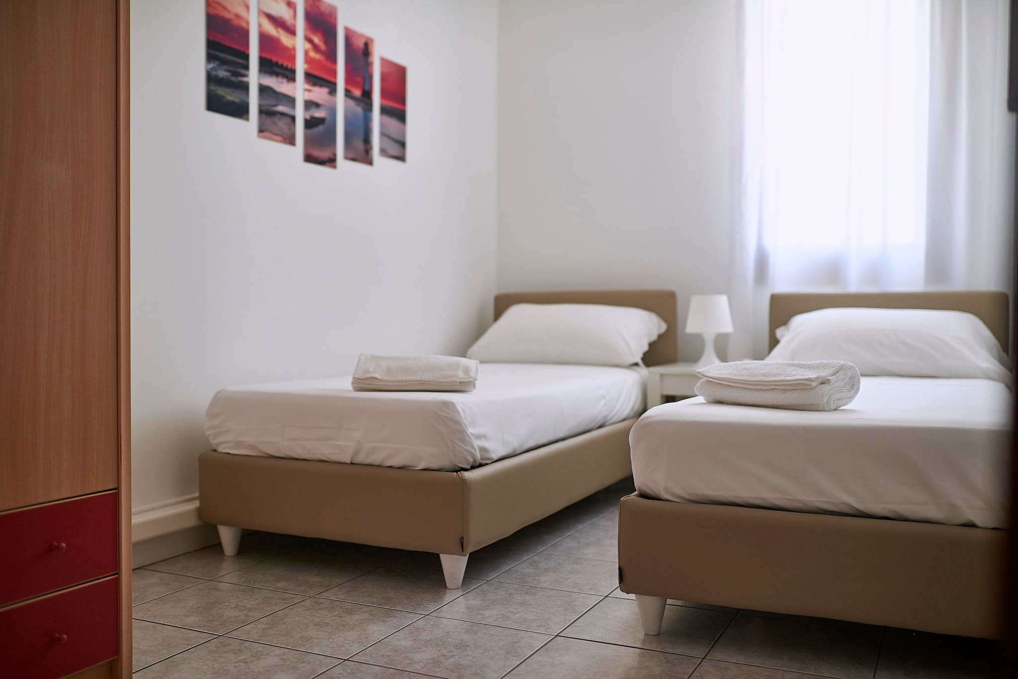 parcheggio privato esterno, soggiorno con balcone, camera matrimoniale e camera singola con due letti. Bagno con doccia e lavatrice
