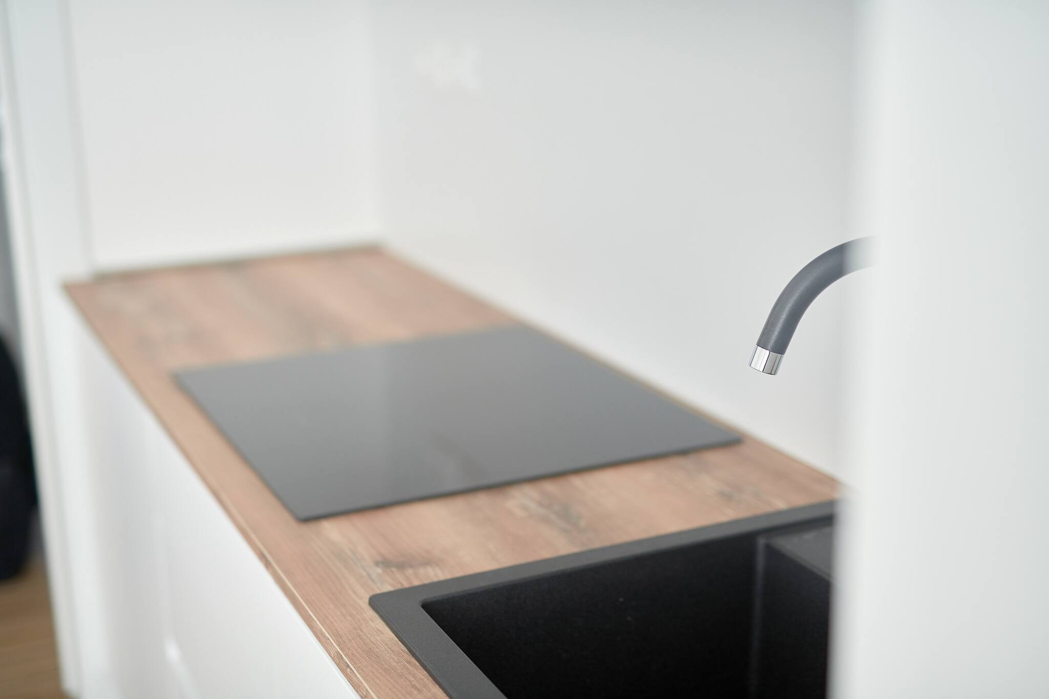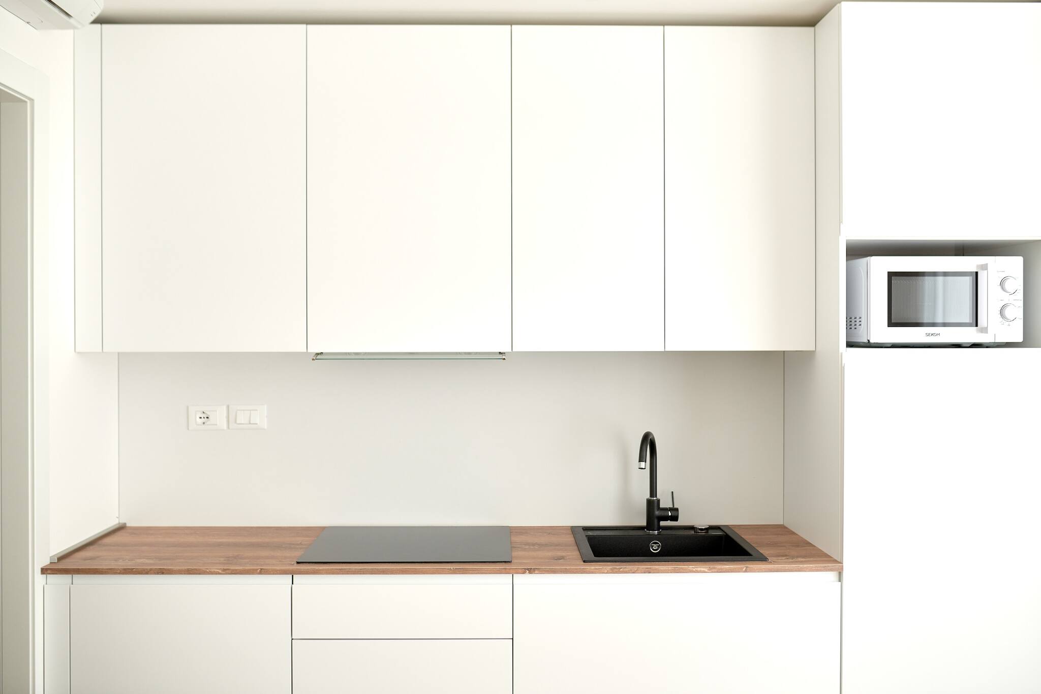 Cucina con piano ad induzione e lavastoviglie. Il soggiorno si affaccia ad un terrazzo con giardino abitabile per poter far colazone o pranzare all’esterno con vista piscina.