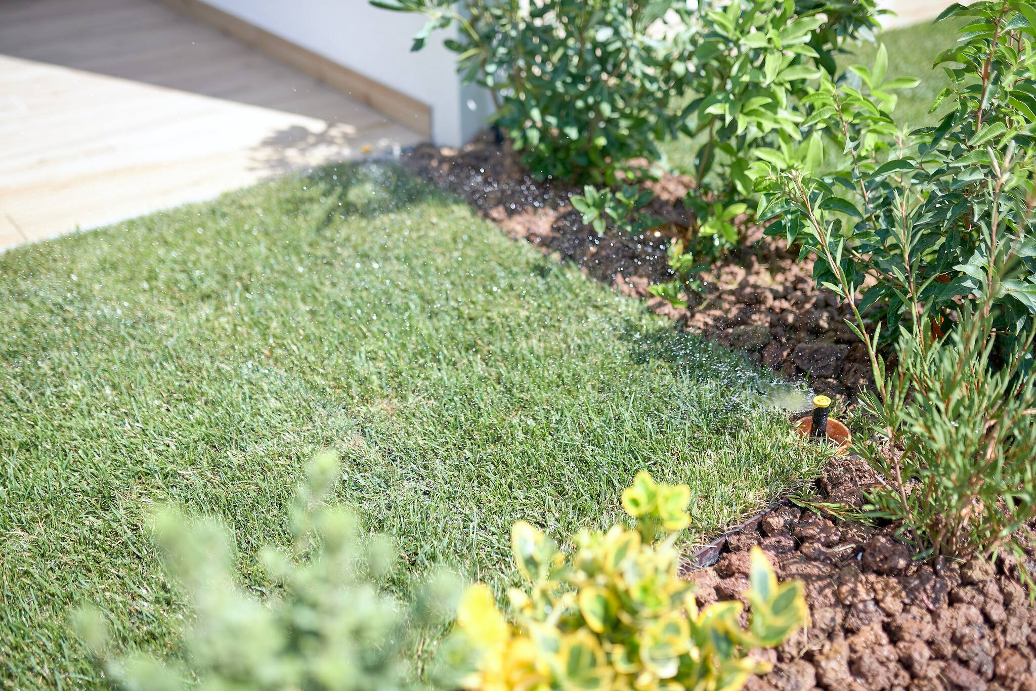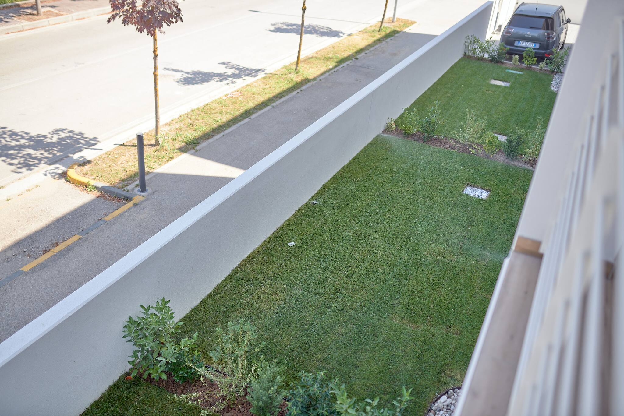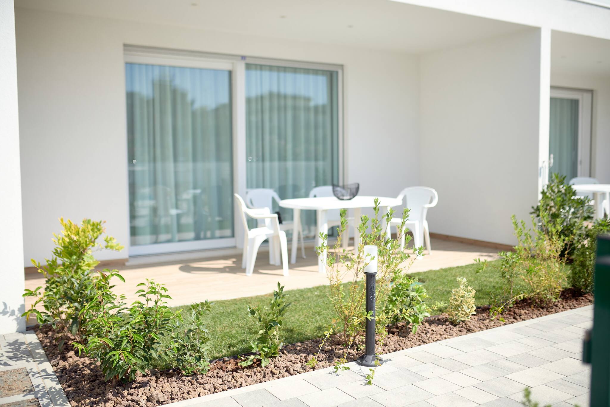 Il soggiorno si affaccia ad un terrazzo con giardino abitabile per poter far colazione o pranzare all’esterno.