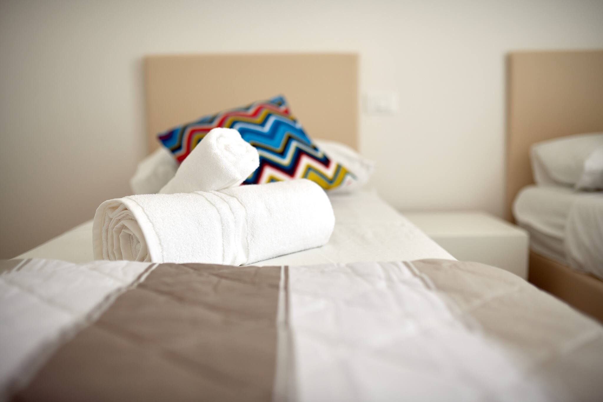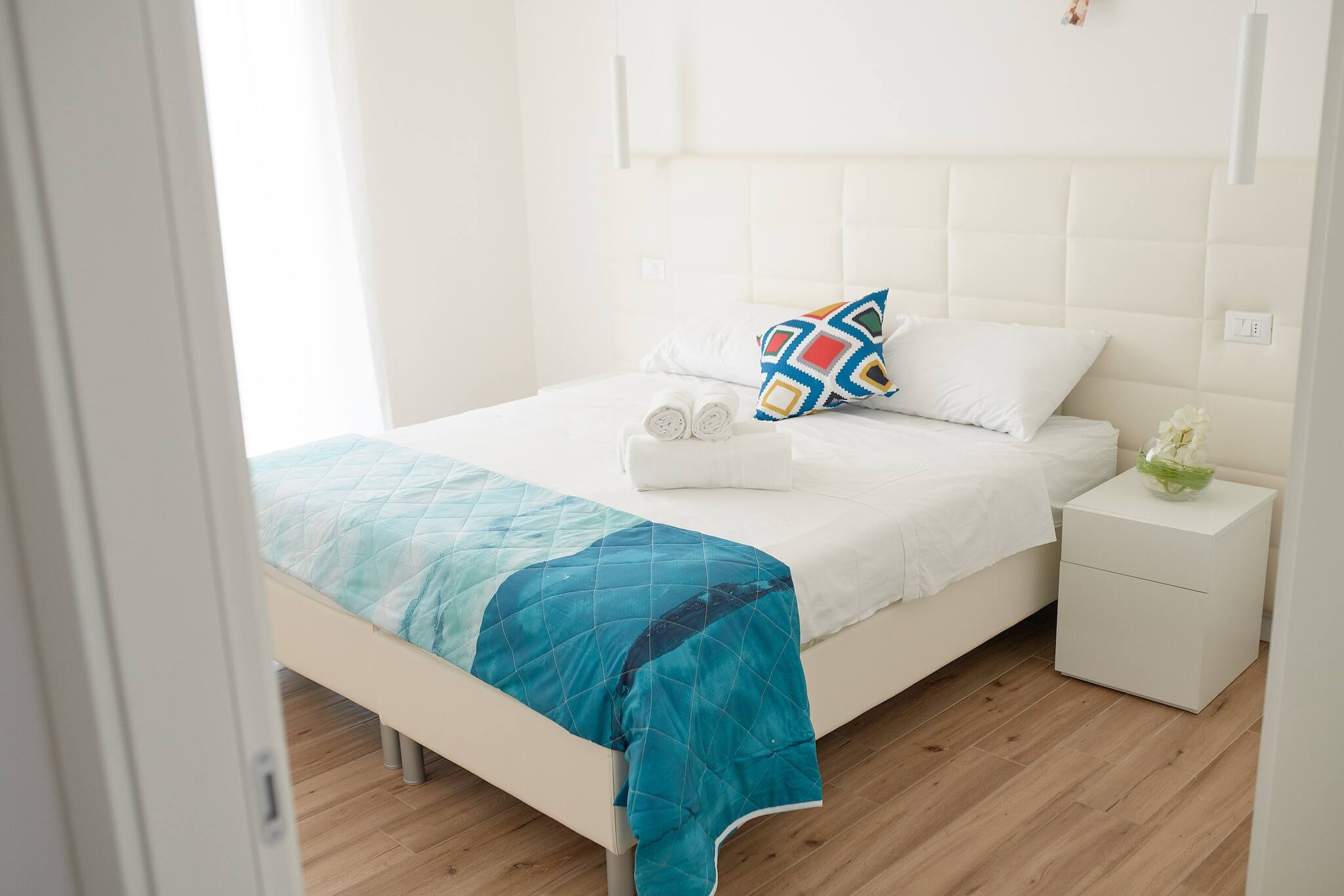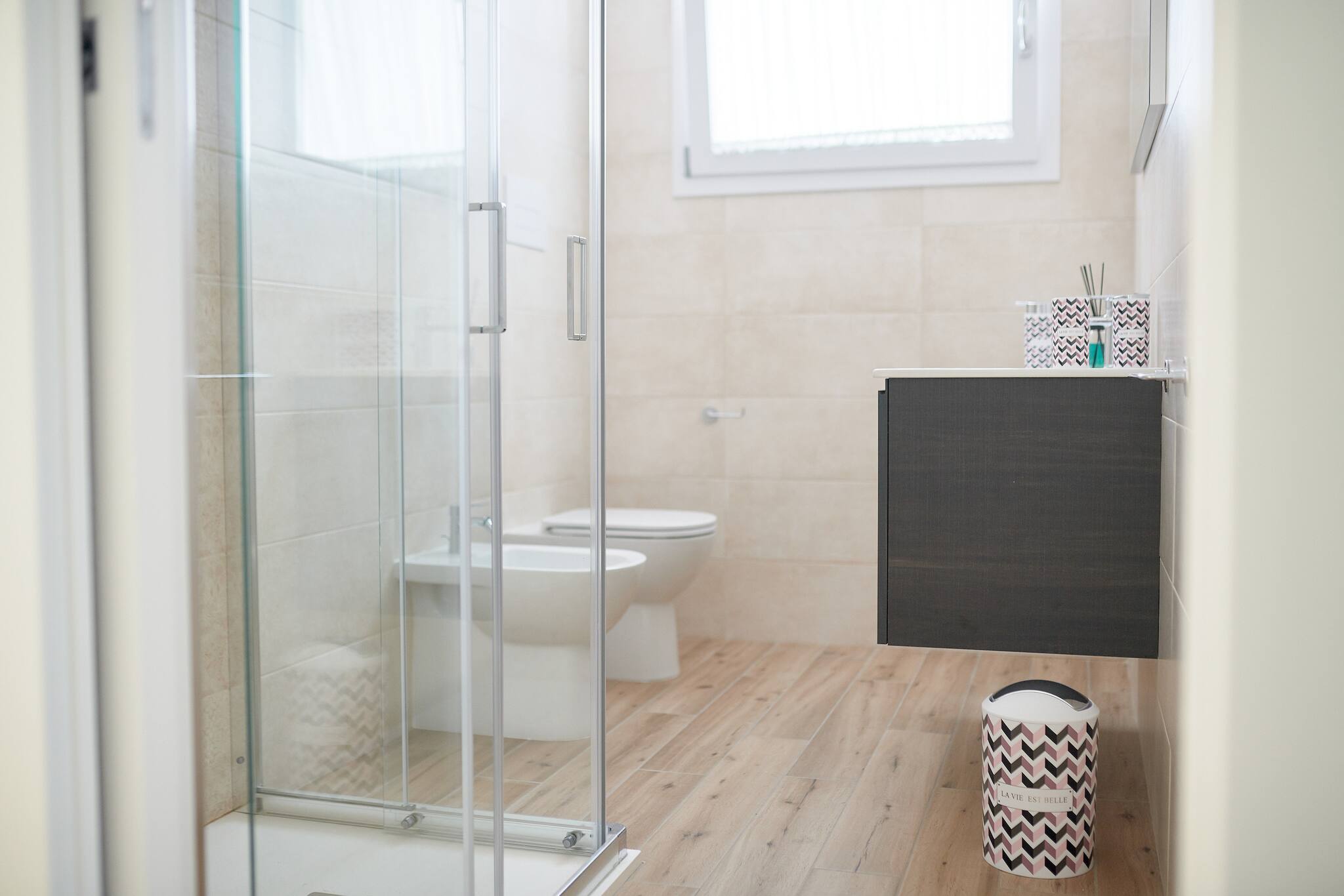 L'appartamento è composto da una camera matrimoniale, una camera con due letti singoli e un divano letto in soggiorno, due terrazze di cui una abitabile, un bagno con piatto doccia 80x120 e una piccola lavanderia con lavatrice.