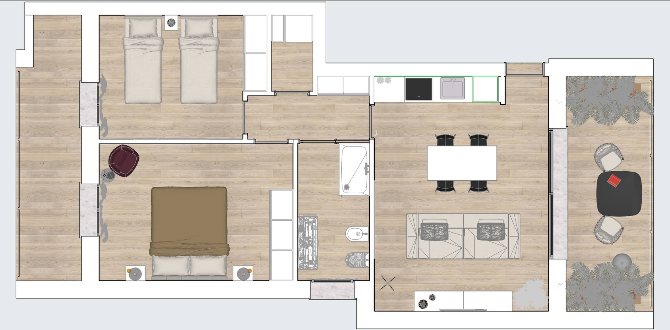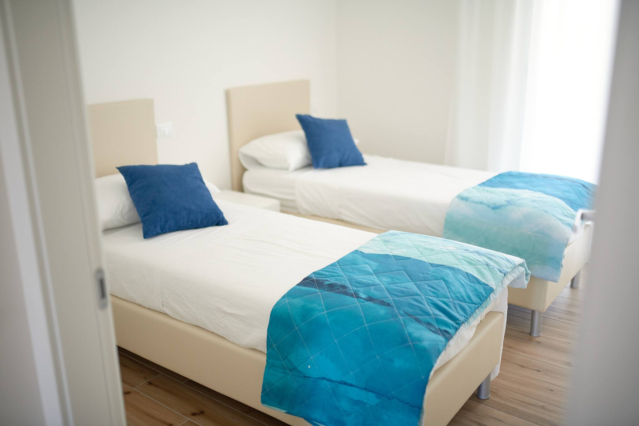 L’appartamento è al piano terra ed è composto da una camera matrimoniale, una camera con due letti singoli e un divano letto in soggiorno, due terrazze con giardino, un bagno con piatto doccia 80×120 e una piccola lavanderia con lavatrice.